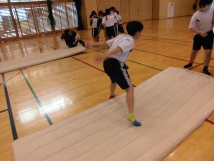 今日の体育では、マット運動を行いました。前転や後転、開脚後転がきれいにできるように、マットに手をしっかり着くことを意識したり、ロイター板を使って後ろへ転がる感覚を身に付けたりしました。今日の学習の中でできる技が増えた子供は、「やったー!」と喜んでいました。
