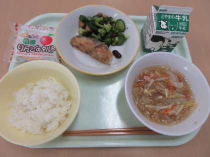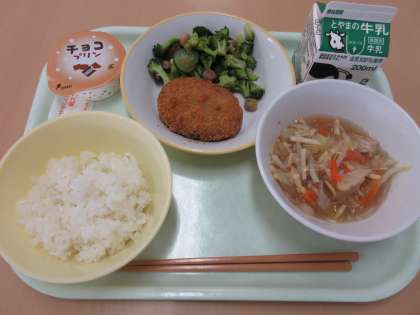 ごはん 牛乳 ◆さかなのあまみそかけ ◆にくじゃがコロッケ ビーンズサラダ はるさめスープ ●りんごタルト ●チョコプリン (◆●は選択献立)