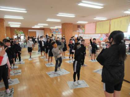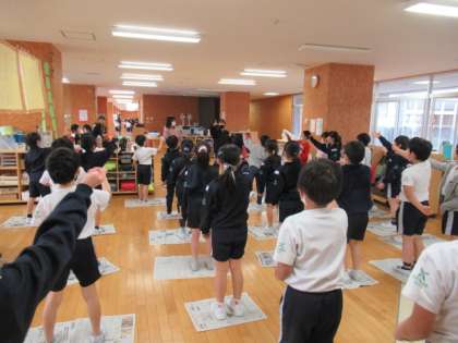 集会委員会企画で、委員会のみなさんが教室に来てくださってゲームをしてくださいました。じゃんけんゲームは、負けたりあいこになったりすると、新聞をどんどん折り曲げていくゲームで、子供たちはとても盛り上がっていました。