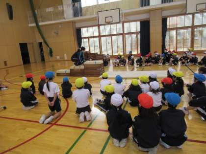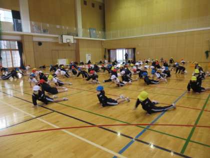 体育では、跳び箱や平均台を使って、跳び箱に慣れる運動をしています。跳び箱の上で蛙跳びをしたり、平均台をジャンプで渡ったりと、いろいろな動きに挑戦しています。手の付き方や、着地の仕方のポイントに気を付けて、練習することができました。