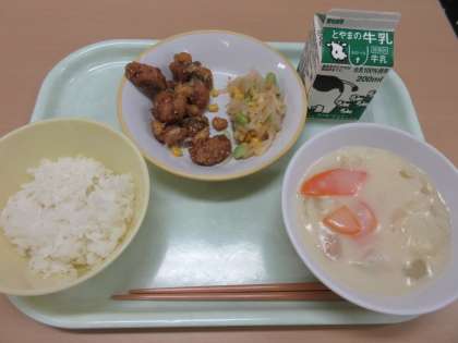 ごはん 牛乳 えだまめサラダ ぶたにくのうめソースかけ さけのこめこシチュー