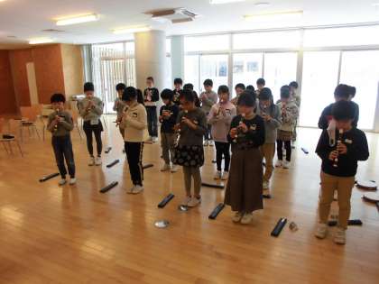 音楽科の学習で、「パフ」の合奏を行いました。リコーダー、打楽器、鉄琴に分かれて、演奏しました。友達の音を聞き合い、きれいな音色を響かせることができました。