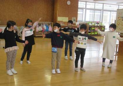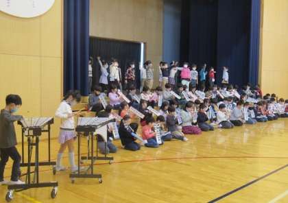 ダンスチームの子供たちは、曲や歌詞の意味を踏まえて、自分たちで動きを考えました。合奏隊は鍵盤ハーモニカや鉄琴等で華やかに演奏します。子供たちが協力して考えたり動いてみたりする姿に、一年間の成長を感じました。