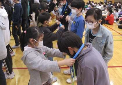 全校児童が一斉に体育館に入ることはできませんでしたが、1年生は体育館で6年生にお祝いのメダルを首にかけてあげる役目になったので、とてもうれしそうに待機していました。