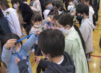 入場してきた6年生に、「これまで、ありがとうございました」と感謝の言葉を伝えながら、一人一人首にかけていました。6年生は、すてきな笑顔で受け取ってくれました。