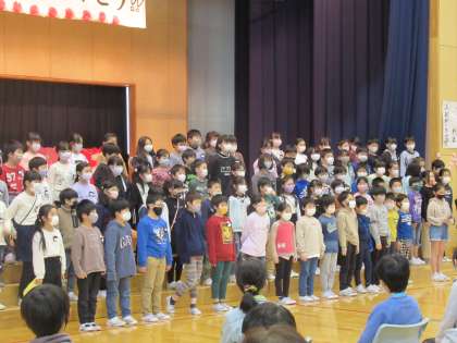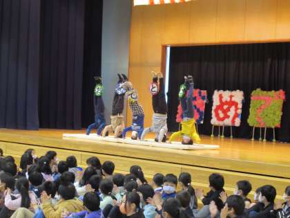 6年生の卒業を祝う集会で、出し物をしました。しゃちほこ隊の三点倒立の披露では、「おぉー」という歓声や盛大な拍手をもらい、担任の先生クイズでは、おもしろい答えが連発するなど6年生に楽しんでもらうことができました。今までいろいろな場面でお世話になった6年生に「感謝の気持ちを伝えられた」と満足そうな子どもたちでした。
