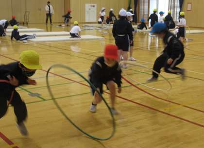 体育科の授業で、いろいろな器具を使って運動をしました。フラフープを腰を振って回転させるだけでなく、なわ跳びのように跳んだり、転がして中をくぐったりと、遊び方をいろいろ工夫しました。