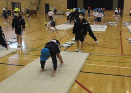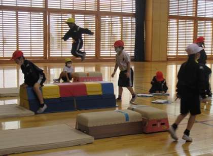 また、マットの上では、転がったり、クマさん歩きをしたりしました。そして、跳び箱では、跳び越したり、上からポーズをしながらジャンプして降りたりと、体中を使って思い切り体を動かしました。子供たちが教室に帰るときに「あ〜おもしろかったね」と話しているのをほほえましく聞いていました。