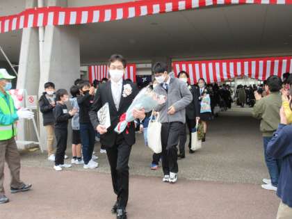 出会いの庭に出た卒業生の周りには家族や5年生が、更には2階のテラスや廊下からは1〜4年生が囲むように集いました。PTAから卒業生担任に花束が贈られた後、卒業生は「ありがとうございました」と最後の挨拶をしていよいよ門出です。「おめでとう」と巣立つ卒業生に声をかける在校生の声が出会いの庭に響いていました。