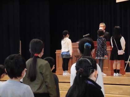 3月24日、令和2年度修了式がありました。子供たちは背筋を伸ばし、校長先生と目を繋いで話を聴いていました。また、元気よく返事をして修了証を受け取ったり、1年間の自分の成長を全校児童の前で堂々と発表したりと、1年間の成長を感じらる姿が見られました。