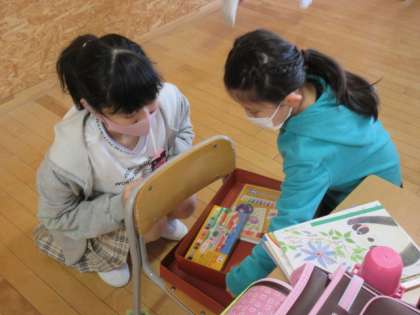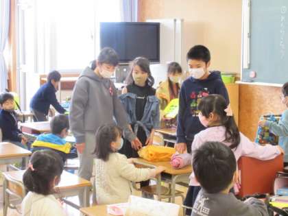 1年生が入学し、朝の準備の見守りを行ってます。ランドセルの片付けや、手洗い・うがいの声かけなど優しく1年生に関わっています。最高学年として、自分たちにできることを考えて行動する姿がたくさん見られます。