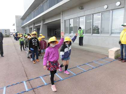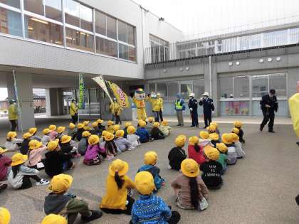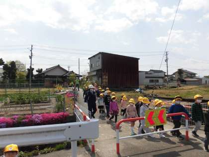 今日は交通安全教室がありました。踏切の渡り方、道路の歩き方等を実際に歩きながら学びました。白線の内側を、列を崩さずに上手に歩くことができました。