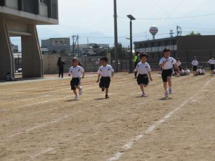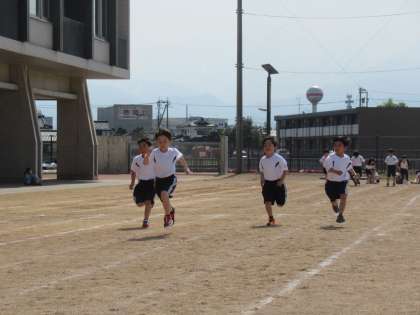 体育科の学習で50メートル走をしました。スタートの時は膝を曲げ、前に体重をかけることや、最後まで駆け抜けることを意識して走りました。子供たちは「前回よりも速く走れたと思う!」とうれしそうな表情でした。