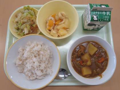 むぎごはん 牛乳 カレーライス ふくじんあえ フルーツポンチ