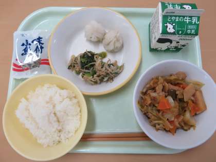 ごはん 牛乳 えびパオツ こまつなのごまあえ ホイコーロー