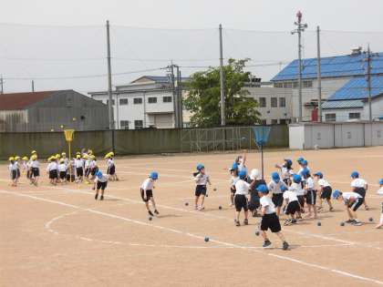 毎日、運動会の練習をがんばっている1年生の子供たちです。玉入れでは、玉の持ち方や投げ方、どこから投げるか等を考えながら練習に取り組みました。