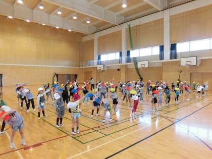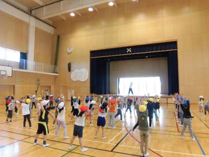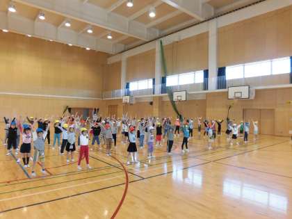 体育館でラジオ体操の練習をしました。話をよく聞き、短時間の練習で指先までぴんと伸ばして体操ができるようになりました。