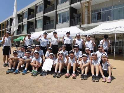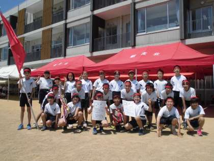 運動会終了後の集合写真です。子供たちは、係の仕事に見通しをもって取り組み、団体競技や応援合戦を全力で行っていました。