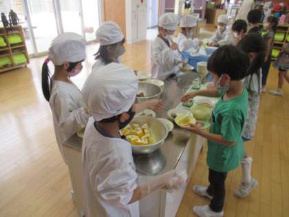 毎日楽しみにしている給食の時間です。1年生は、だんだん給食当番にも慣れ、配膳するのが早くなってきました。たくさんおかわりして、たべキリンを目指しています。