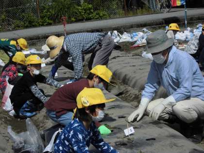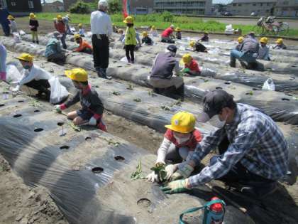 地域の方と一緒に、さつまいもの苗植えをしました。