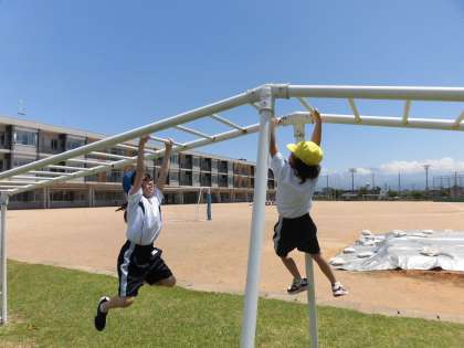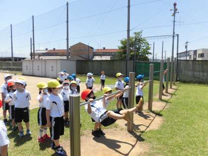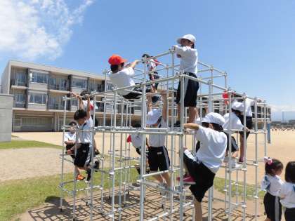 体育科の学習では、ジャングルジムやうんてい、鉄棒を使った運動遊びに取り組んでいます。友達と楽しみながら元気いっぱい体を動かして遊んでいます。