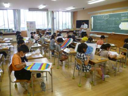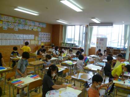 図工の時間に、「ふしぎなたまご」の絵を描いています。友達と作品を見せ合ったり、たまごの割れ方を考えたりしながら、とても楽しそうに取り組んでいました。どんな作品に仕上がるのか楽しみです。