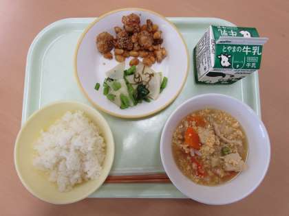 ごはん 牛乳 だいずとホタテのごまからめ こんぶあえ たまごとじ