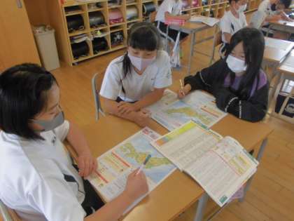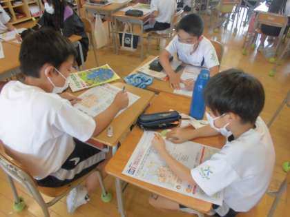 社会科の時間に地図帳のさくいんを使って、いろいろな県について調べる活動を行いました。ページ番号だけでなく、縦の数字と横の記号が重なるところを見付けなくてはいけません。初めは苦戦していましたが、すぐに慣れ、「早く次の問題出して」と楽しんで取り組んでいました。