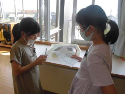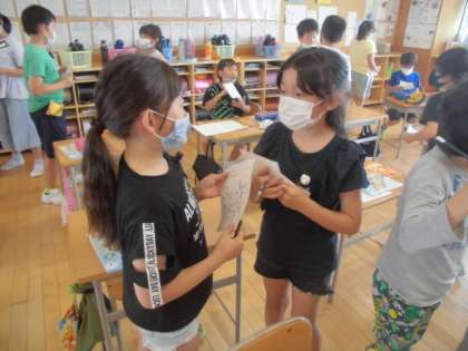 外国語活動で、AチームとBチームに分かれ、お互いのワークシートに書かれた地域の天気を尋ねる学習をしました。グレッグ先生とも何度も練習したフレーズなので、どの子も自信をもって"How's the weather in okinawa?" " It's sunny."等と発音することができました。月や曜日の表現もすらすらに言えるようにがんばっています。