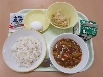 むぎごはん 牛乳 かみかみカレー ゆでたまご きりぼしだいこんのサラダ あじつけこざかな