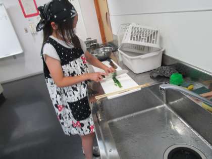 家庭科の授業で、初めて包丁を使って調理実習をしました。ほうれん草をゆで、包丁で切りました。包丁の使い方や運び方に気を付けて、安全に取り組むことができました。自分たちで作ったおひたしを食べた子供たちは「おいしい!」とうれしそうでした。