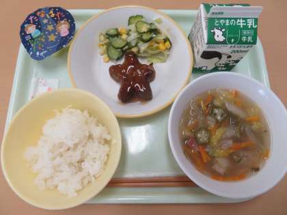 ごはん 牛乳 ほしがたハンバーグ コーンサラダ あまのがわスープ