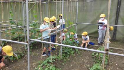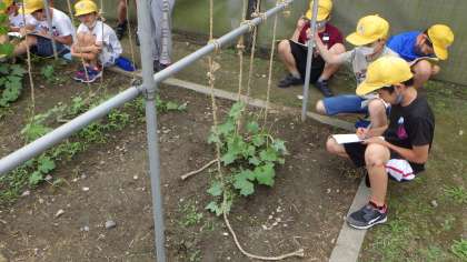 理科の学習で育てているヘチマが育ってきました。植え付けた頃と比べて、どのような変化があるかをじっくりと観察しました。