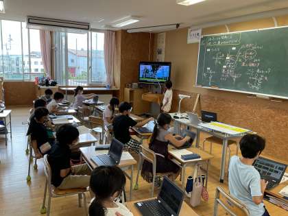 クロムブックを使って育てている植物の写真を撮りためてきました。「校庭で見付けた植物も自分の育てている植物と同じ体のつくりをしているのだろうか」と疑問をもち、校庭で撮った植物と自分の育てている植物を比較しました。自分の考えの根拠を示すために、テレビに映して、写真を拡大したり、指示棒で指し示したりしながら説明していました。今後もICTをうまく使い、考えを伝える技術を身に付けてほしいと思います。