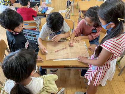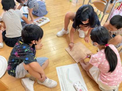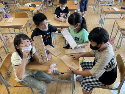 123m花畑の看板を作っています。1人で10cm×30cmの板に絵を描き、それを4人〜5人の班で合わせて看板にします。最初にどのようなデザインにするかを班で考えました。子供たちは虹や様々な花を描き、楽しい雰囲気が出るように工夫してます。出来上がりが楽しみです。