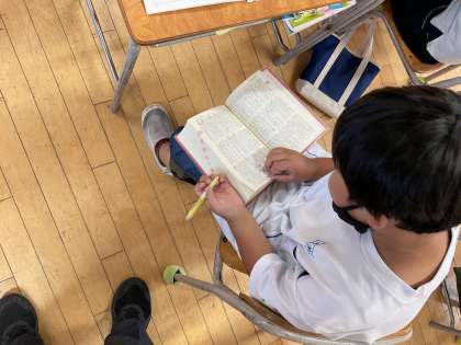3年生は国語科の授業で国語辞典の引き方の学習をします。4月から机の横にかけて分からない言葉があればすぐに辞書を引くようにしています。調べた言葉にはマーカーで目印を付けています。だいぶマーカーが付いた言葉が集まってきました。