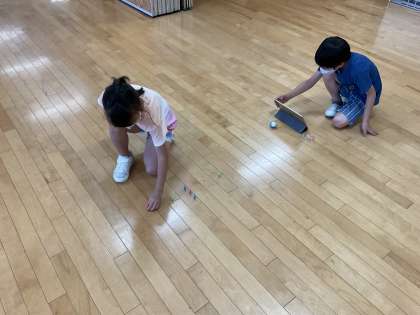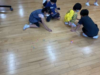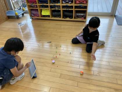 プログラミング教材のShpero miniを使ってプログラミングを体験しました。今日はボーリングのミニピンを倒すためにSphero miniを意図どおりに動かすプログラムを考えました。ペアで話し合ってよく考えて、試行錯誤していました。