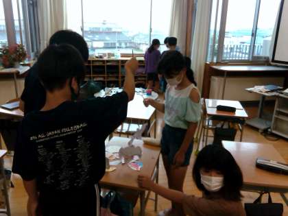 園児との交流に向けて、準備を進めています。遊び道具をつくったり、声掛けの仕方を考えています。