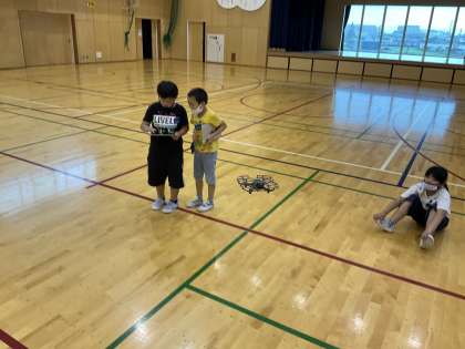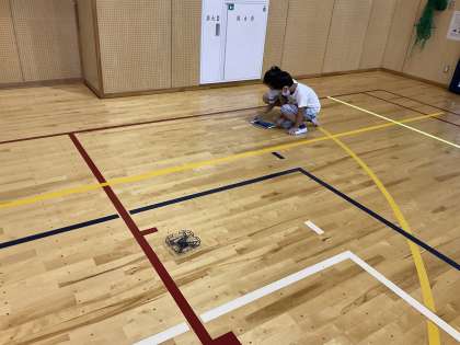 教育用ドローンを使いってプログラミング学習を行いました。目的地に着陸できるようにペアで話し合いながら試行錯誤していました。現実に動くものを使ってプログラミング的思考力を育てています。