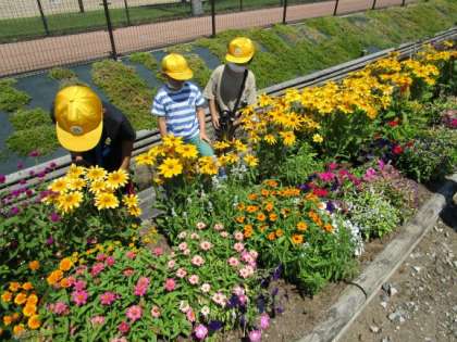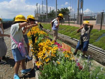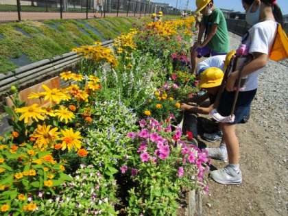 123m花畑の様子を久しぶりに見に行きました。元気に咲いている花の様子を見て、楽しそうに話していました。夏休み中も毎日花畑のお世話をしてくださっているグリーンキーパーの方に思いを馳せ、「花が元気に咲いているのは地域の方々のおかげです。心から感謝しています。」「123m花畑のお世話をしてくださり、ありがとうございます。夏休みが終わったら、水やりをがんばります。」等、グリーンキーパーの方への感謝の気持ちをワークシートに記しました。グリーンキーパーの方の努力を聞いて、子供たちもがんばりたいと意欲を高めていました。