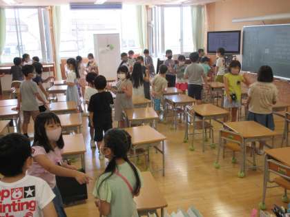 その後、各学級でじゃんけんゲームをしたり、夏休みの思い出を発表したり、2学期の目当てを考えたりしました。