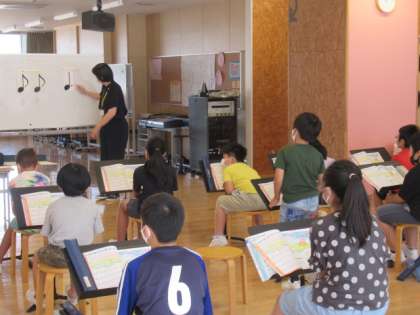 音楽の授業では「風のメロディー」を学習しました。子供達は手をたたいたり、身体を揺らしたりしながら曲の拍子やリズムを感じ取ろうと工夫する姿が見られ、6拍子の特徴を感じ取ることができました。