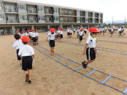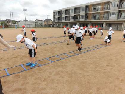体育でラダーに取り組みました。小さなジャンプや大きいジャンプ等、みんな一生懸命に取り組みました。