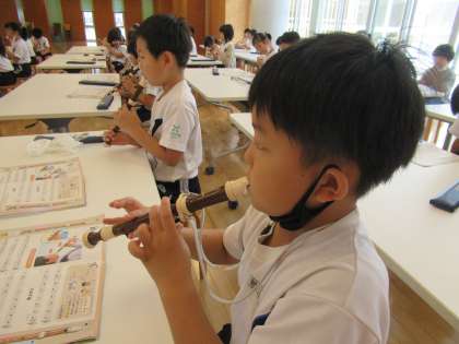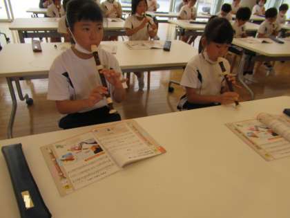 今日の音楽科の学習では、リコーダーで「ド」と「レ」の音を出す練習をしました。リコーダーの持ち方やタンギングに気を付けて練習に取り組む子供たちでした。