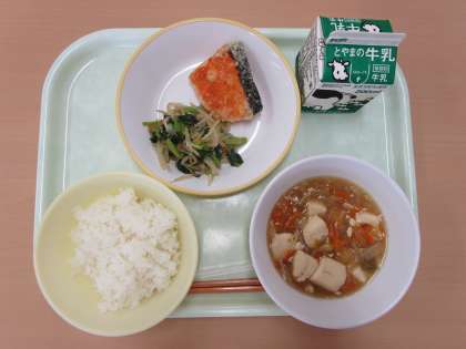 ごはん 牛乳 さけのからあげ こまつなともやしのこうみあえ とうふのやさいあんかけ