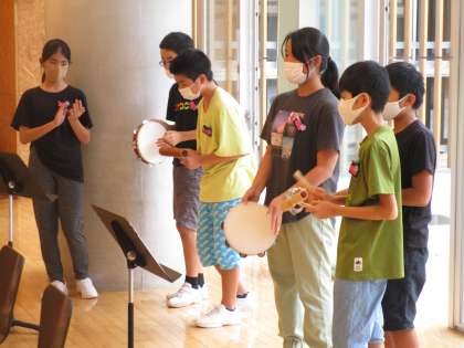 音楽の学習では、「ラバーズコンチェルト」の演奏にリズム伴奏を付けています。どの打楽器を使うか、グループで考えて決めました。