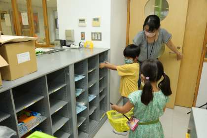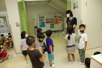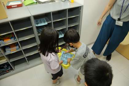 職員室へお便りを取りに行く仕事の説明を聞きました。緊張しながらも大事な仕事を任され、うれしそうな子供たちです。