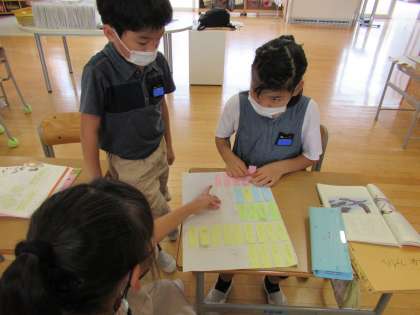 今日の国語の学習では「山小屋で3日間すごすなら何をもっていくか」というテーマでグループで話合いをしました。グループで出てきた意見を整理しながら話合いを進めました。