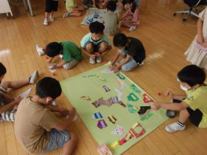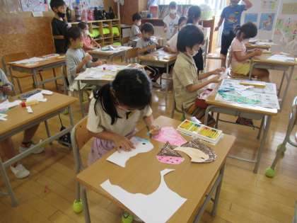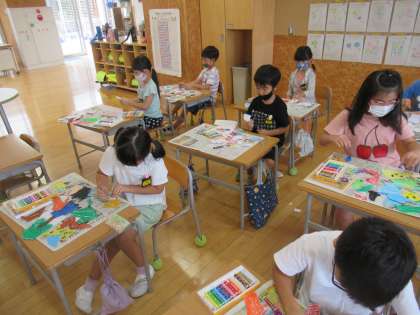図画工作科の時間に、いろいろな形や大きさの紙から想像を広げ、絵を描きました。食べ物や生き物等、いろいろなものができました。友達の作品を見合ったり、褒め合ったりしながら楽しく活動しました。最後には、クラスでできた作品を並べて貼り、にぎやかに仕上がりました。