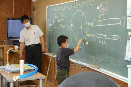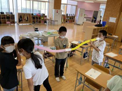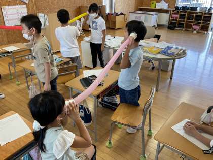 音と振動は関係していると考えだした子供たち。「大きな風船と細長い風船ではどちらがよく音を伝えるのだろうか?」について考えることで、音の性質に考えを巡らせました。